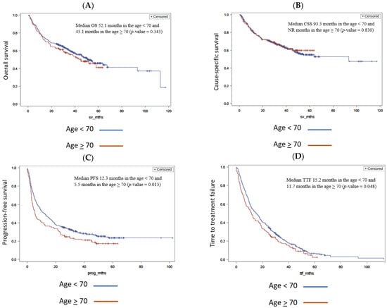 The median OS was 52.1 months in the age <70 group and 45.1 months in the age ≥70 group (p-value 0.343 in univariate analysis, 0.352 multivariate) (Figure 1A). Median cause-specific survival (CSS) due to renal cell carcinoma was 93.3 months in the age <70 group and not reached in the age ≥70 group (p-value 0.830 in univariate analysis, 0.897 in multivariate analysis) (Figure 1B). The median PFS was 12.3 months in the age <70 group and 5.5 months in the age ≥70 group (p-value 0.013 in univariate analysis, 0.019 in multivariate analysis) (Figure 1C). The median TTF was 15.2 months vs. 11.7 in the age <70 group and the age ≥70 group, respectively, (p-value 0.048 in the univariate and 0.077 in the multivariate analysis) (Figure 1D). Response rates were similar in both groups, with a disease control rate of 62.2% (229/368) in the age <70 group compared to 60.7% (68/112) in the age ≥70 group (Table 1).
