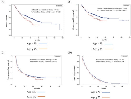 The median OS was 53.7 months in the age <75 group and 30.0 months in the age ≥75 group (p-value 0.032 in univariate and 0.157 in multivariate analysis) (Figure 2A). Median cause-specific survival was 93.3 months in the age <75 group and 45.3 months in the age ≥75 group (p-value 0.127 in univariate and 0.320 in multivariate analysis) (Figure 2B). The median PFS was 10.2 months in the age <75 group and 6.6 months in the age ≥75 group (p-value 0.287 in univariate and 0.386 in multivariate analysis) (Figure 2C). The median TTF was 13.9 months vs. 14.6 in the age <75 group and age ≥75 group, respectively, (p-values 0.444 and 0.469 in multivariate analysis) (Figure 2D). Response rates were similar in both groups, with disease control at 61.3% in the age <75 group (264/431) and 67.3% (33/50) in the age ≥75 group (Table 2).