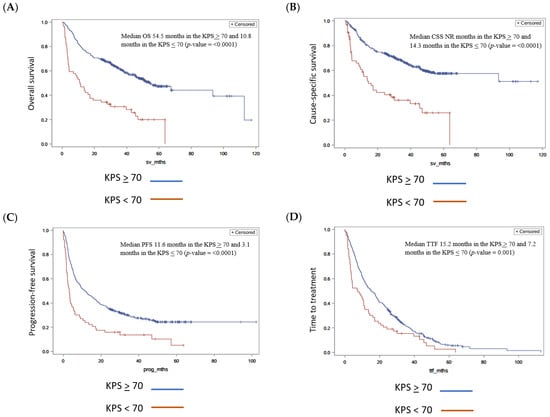 Comparisons of outcomes for KPS > 70 and KPS < 70. Kaplan–Meier curves for KPS < 70 and KPS > 70. (A) Overall survival comparing KPS < 70 and KPS > 70, (B) cause-specific survival comparing KPS < 70 and KPS > 70, (C) progression-free survival comparing KPS < 70 and KPS > 70, and (D) time to treatment failure comparing KPS < 70 and KPS > 70. NR = not reached.