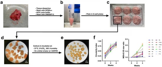 Images were captured using a brightfield microscope at 0, 2, and 4 weeks. Changes in size were quantified by measuring the 2D projected area of tissues/organoids, outlined manually for accuracy. Tissue circularity was assessed using the Circularity plugin, where a value of 1 represents a perfect circle. All analyses were performed using ImageJ software 2.14.
