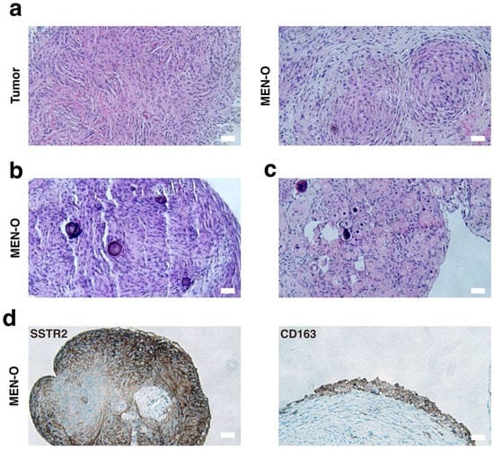 Histopathological analysis of patient-resected meningioma and corresponding meningioma organoid. (a) H&E staining of a patient resected meningioma (left panel) and corresponding established organoid (right panel) showing recapitulation of the tumor’s histological cytoarchitecture and cellular composition. (b) Organoid containing psammoma bodies, likely retained from the original tumor given the short incubation period. (c) Organoid displaying characteristic whorl pattern seen in meningiomas. (d) Strong SSTR2 immunostaining in tumor organoids (left panel) and CD163 immunostaining of tumor organoids highlighting tissue macrophages/histiocytes (right panel). MEN-O, meningioma organoid; SSTR2, somatostatin receptor 2. Scale bar, 100 µm.