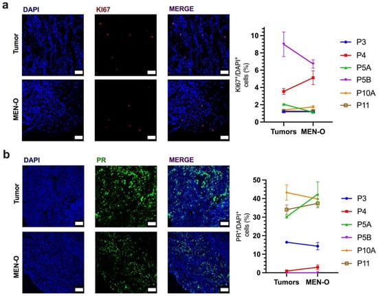 Immunofluorescent analysis of patient-resected meningioma and corresponding meningioma organoid. (a) KI67 staining of original tumor tissues and corresponding tumor organoids to analyze and quantify cellular proliferation. (b) Progesterone receptor (PR) staining and quantification of the patient-resected meningioma and corresponding organoids. Scale bar, 50 µm. Error bars represent ±SEM.