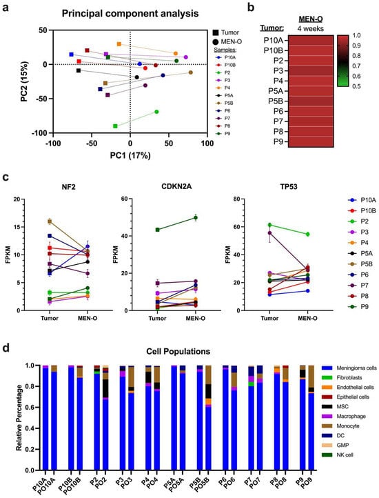 To analyze the cellular composition of the meningiomas and MEN-Os, the bulk RNA sequencing data was deconvoluted. Single-cell RNA sequencing data from six meningiomas were obtained [30]. Cell clusters were then identified using dimensionality reduction analysis, and cell populations with similar expression signatures were concatenated. A final reference matrix was then constructed (Supplementary Figure S3). Deconvolution analysis revealed an overall retention of different tumoral cellular populations in the MEN-Os. Meningioma tumor cells and stem cells were retained at varying proportions, closely reflecting the parent tumor population (Figure 4d). Additionally, non-neoplastic cell populations, including endothelial cells and immune cells such as macrophages and dendritic cells, were also preserved in the MEN-Os.