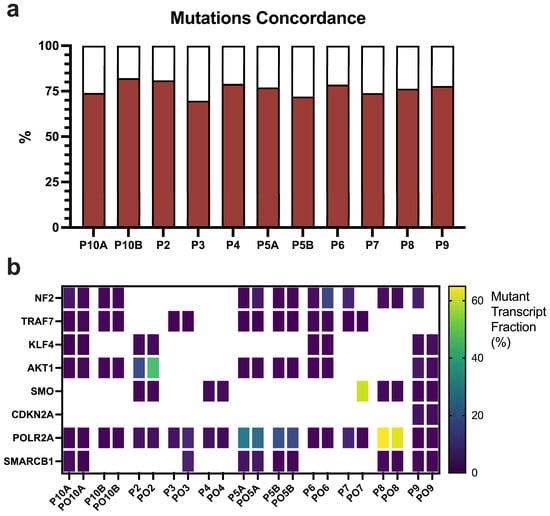 To analyze transcriptomic mutations, we utilized the rnaseqmut pipeline (https://github.com/davidliwei/rnaseqmut, accessed on 20 January 2025). Aligned and sorted reads were processed through the pipeline alongside the reference genome, enabling mutation calling, which identify single nucleotide polymorphisms (SNPs) and insertions/deletions (indels) directly from RNA-seq data. The results were compared between the original tumor tissues and their corresponding MEN-Os. Mutation similarity was analyzed at the SNP/indel level by assessing the concordance of mutant transcript fractions.