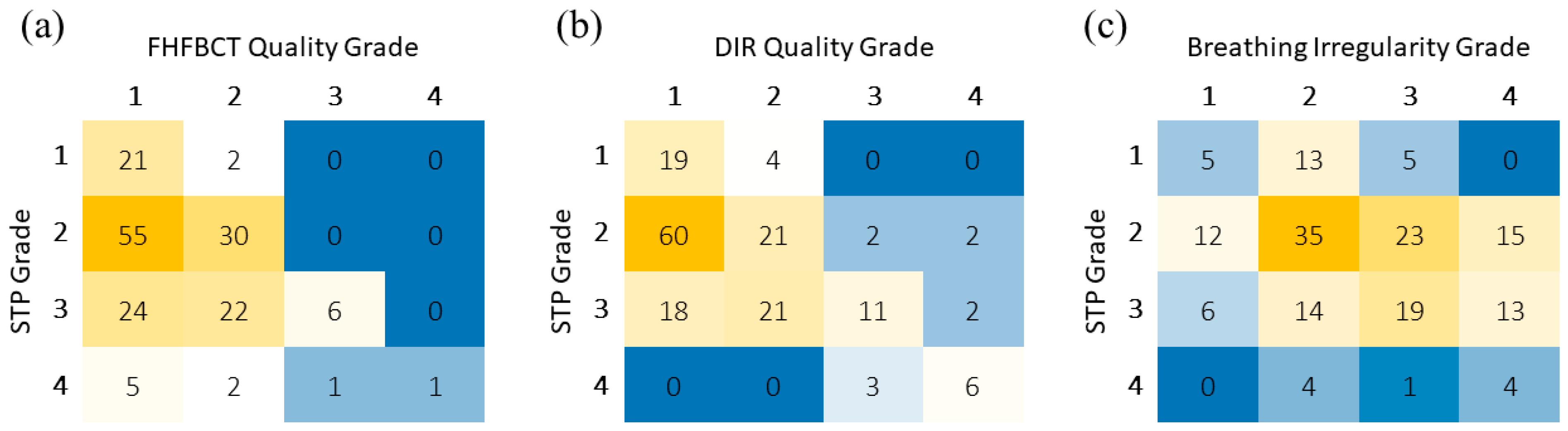 | Breathing irregularity Grade vs. Suitability for Treatment Planning Grade | 0.260 (p < 0.001) | [0.109, 0.399] |