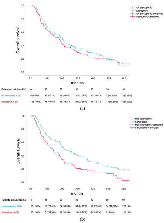 (a) Overall survival in the skeletal muscle index-assessed cohort with sarcopenia defined according to Prado et al. Median overall survival was 17.9 months for sarcopenic patients versus 20.11 months for not sarcopenic patients (p = 0.58). (b) Overall survival in the skeletal muscle index-assessed cohort with sarcopenia defined according to the cohort-specific thresholds. Median overall survival was 12.75 months for sarcopenic patients versus 21.13 months for not sarcopenic patients (hazard ratio for death 1.654; p = 0.002).