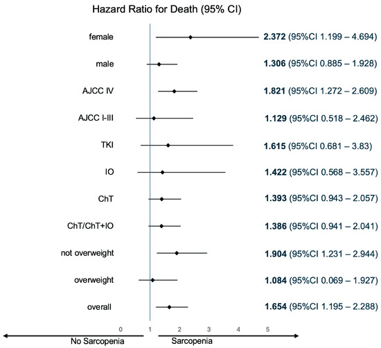 Forest plot for subgroup analysis of overall survival. CI, confidence interval; AJCC, American Joint Committee on Cancer; TKI, tyrosine kinase inhibitor; IO, immunotherapy; ChT, chemotherapy; and ChT/ChT + IO, chemotherapy or chemoimmunotherapy. Not overweight corresponds to a body mass index < 25 kg/m2, i.e., underweight or normal weight and overweight corresponds to a body mass index ≥ 25 kg/m2, i.e., overweight or obese.