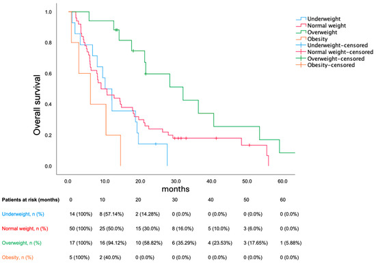 Overall survival in sarcopenic patients according to BMI. BMI, body mass index. Underweight corresponds to a BMI < 18.5 kg/m2; normal weight corresponds to a BMI ≥ 18.5 kg/m2 and <25 kg/m2; overweight corresponds to BMI ≥ 25 kg/m2 and <30 kg/m2; and obesity corresponds to BMI ≥ 30 kg/m2.