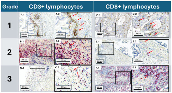 Immunohistochemical intra-tumoral lymphocyte staining of appendiceal cancer in various grades. CD3+ lymphocytes and CD8+ lymphocytes are represented on the left and right sides, respectively. (A.1) (with magnified field in (A.2)) represents a grade 1 LAMN with high CD3+ density within the submucosa and lamina propria (889.0 cells/mm2). (B.1) (with magnified field in (B.2)) represents a grade 2 AC NOS with intermediate CD3+ density within the lamina propria (568.7 cells/mm2). (C.1) (with magnified field in (C.2)) represents a grade 3 mAC with low CD3+ density within the submucosa and lamina propria (442.2 cells/mm2). (D.1) (with magnified field in (D.2)) represents a grade 1 mAC with high CD8+ density within the lamina propria (1366.4 cells/mm2) surrounding globules of acellular mucin for which the area of was excluded in our analysis of the region of interest. (E.1) (with magnified field in (E.2)) represents a grade 2 LAMN with intermediate CD3+ density within the lamina propria (316.4 cells/mm2). (F.1) (with magnified field in (F.2)) represents a grade 3 mAC with low CD3+ density within the submucosa (25.8 cells/mm2) as well as high lymphocytic densities within the mucosa, which was excluded in our analysis of intra-tumoral cellular densities. Red arrows depict examples of and are adjacent to either chromogen red or brown positive lymphocytes which were selected for in our analysis.