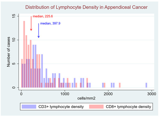 Distribution of Lymphocyte Density in Appendiceal Cancer. This histogram represents the distribution of CD3+ (purple) and CD8+ (red) lymphocyte densities across the cohort. The overall CD3+ cell density (median 397.9 cells/mm2; 95% CI [206.0, 756.9]) exceeded the CD8+ cell density (median 225.6 cells/mm2; 95% CI [105.2, 415.1]). The distribution was non-normal, exhibiting rightward skew and kurtosis (p < 0.0001 for both CD3+ and CD8+ densities). The purple bars represent the density of CD3+ T cells, which include all T lymphocytes, whereas the red bars represent the subset of CD8+ cytotoxic T cells, which inherently express CD3 as part of the T cell receptor complex.