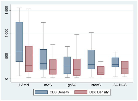 Comparison of four distinct and a subclassified histotype group including low grade appendiceal mucinous neoplasm (LAMN), mucinous adenocarcinoma (mAC), goblet cell adenocarcinoma (gcAC), signet ring cell adenocarcinoma (srcAC), and adenocarcinoma not otherwise specified (AC NOS). Among histologic tumor types, LAMN contained the highest density (589.3 [374.0, 1243.2]) of both CD3+ (p = 0.02). There was no statistical difference in CD8 densities, although LAMN had the highest concentrations (287.9 [152.2, 716.3], p < 0.08).