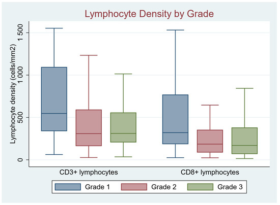In low histologic grade, there was a strong association with higher CD3+ density (547.2 [338.6, 1095.8] compared to 309.2 [161.7, 593.0] and 310.9 [205.3, 558.6] for Grade 2 and Grade 3, respectively, p < 0.02). Similarly, CD8+ density was also higher in low grade tumors (320.7 [184.8, 770.3] compared to 185.3 [86.3, 354.5] and 169.3 [68.2, 381.7] for Grade 2 and Grade 3, respectively, p < 0.02).