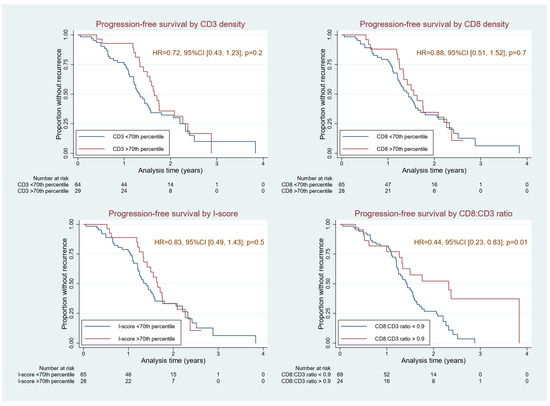 On univariable analysis, PFS was not associated with CD3+ or CD8+ cell densities or I-score but was associated with CD8+:CD3+ density ratio (HR 0.6, 95%CI [0.4, 1.0]); p = 0.04). For CD3+ and CD8+ cell density and I-score, the 70th percentile was selected as a cutoff by convention. On multivariable analysis, CD8+:CD3+ cell density ratio was independent of age, grade, and site of tissue biopsy (HR 0.39, 95%CI [0.20, 0.73], p = 0.004) and a predictor of improved PFS in appendix cancer.
