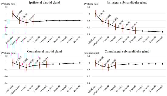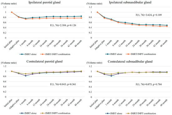 The VR changes of salivary glands over time are shown in Figure 1. There was an initial sharp decline in the VR of the ipsilateral PG shortly after RT started, reaching 0.74 in 1 month of RT ending (p < 0.001). Following this initial sharp decline, the VR stabilized between 0.77 and 0.81 throughout the follow-up period. In contrast, there was a continuous decline in the VR of the ipsilateral SMG until 24 months after RT ended (p < 0.001), which decreased continuously and reached approximately 0.47 by 48 months. The VRs of the contralateral PG and SMG initially decreased (up to 0.86 of the initial volume by 1 month after RT end) and subsequently showed gradual recovery, reaching almost the initial volume (1.00 and 0.97 for the contralateral PG and SMG, respectively) in 48 months of RT ending. The changes in the VRs over time according to the treatment groups are shown in Figure 2, which indicate no significant differences over time between the two groups.