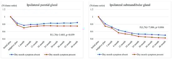 Figure 3 illustrates the salivary gland VR change according to the presence of grade-1–2 dry mouth. The volume reductions over time in the ipsilateral salivary glands were greater in patients with dry mouth symptom, which suggested a correlation between salivary gland volume reduction and dry mouth symptom. However, the changes in the contralateral salivary gland volumes were not significantly associated with dry mouth symptom.