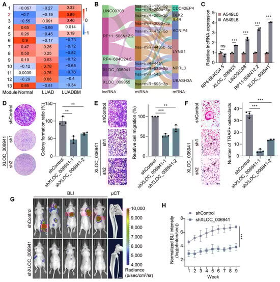 lncRNAs function as molecular sponges for miRNAs, modulating mRNA expression by sequestering miRNAs [,,,]. Based on this, we constructed a ceRNA network using interactions from non-coding RNA databases [,,,], identifying 5 key lncRNAs, 10 miRNAs, and 7 mRNAs as central components of the network (Figure 1B). The expression levels of the five lncRNAs progressively increased from normal lung tissues to LUAD, and further to LUADBM tissues (Figure S1C). To validate the expression of these lncRNAs, we utilized A549L6 cells, a LUADBM cell line derived from A549L0 cells through three rounds of bone metastasis induction by left ventricular injection into mice []. Four out of the five lncRNAs were upregulated in A549L6 cells compared to A549L0 cells (Figure 1C), with XLOC_006941 showing the most significant upregulation.