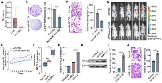 hsa-miR-543 and NPRL3 as downstream molecules regulated by XLOC_006941 function in the progression of LUADBM. (A) Normalized hsa-miR-543 expression in LUAD and LUADBM microarray data; (B) Colony formation images (left) and statistical analysis (right) comparing hsa-miR-543 overexpression (OE) cells to controls; (C) Transwell assay images (left) and bar graph (right) of control and hsa-miR-543 overexpression cells. Scale bar, 200 µm; (D) BLI showing the effect of AAV negative control (NC) and AAV hsa-miR-543 in a LUADBM mouse model induced by H441 left ventricular injection; (E) Weekly variation in AAV hsa-miR-543 treatment compared to AAV NC via tail vein injection in a LUADBM mouse model induced by H441 left ventricular injection; (F) Normalized NPRL3 expression in normal, LUAD, and LUADBM tissues; (G) Relative NPRL3 RNA expression in BEAS-2B, A549L0, and A549L6 cells; (H) NPRL3 protein expression in BEAS-2B, A549L0, and A549L6 cells; (I) Colony formation ratios comparing NPRL3 overexpression cells to controls; (J) Transwell assay images (left) and bar graph (right) of control and NPRL3 overexpression cells. Scale bar, 200 µm. Data shown represent mean ± s.e.m. (n = 3). * p < 0.05, ** p < 0.01, *** p < 0.001; p values were analyzed by the unpaired, two-tailed t-test or one-way ANOVA multiple comparisons test.