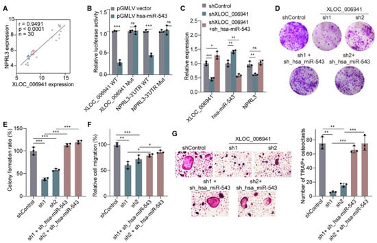 XLOC_006941 sponges hsa-miR-543 to rescue NPRL3, forming a ceRNA network that regulates LUADBM progression. (A) Expression correlation between XLOC_006941 and NPRL3 in LUADBM microarray data; (B) Relative luciferase activity displays the interaction between XLOC_006941 WT/Mut or NPRL3 3′UTR WT/Mut and hsa-miR-543. WT, wild type; Mut, mutant; (C) Relative expression in XLOC_006941 knockdown and double knockdown of XLOC_006941, hsa-miR-543 cells; (D) Representative images of colony formation in XLOC_006941 knockdown and XLOC_006941, hsa-miR-543 double knockdown cells; (E) S Statistical analysis of colony formation in XLOC_006941 knockdown and double knockdown cells; (F) Wound healing assay results after 24 h; (G) BMM osteoclastogenesis assay results after 7 days, with representative images (left) and statistical analysis (right). Scale bar, 200 µm. Data shown represent mean ± s.e.m. (n = 3). ns, not statistically significant, * p < 0.05, ** p < 0.01, *** p < 0.001; p values were analyzed by the unpaired, two-tailed t-test or one-way ANOVA multiple comparisons test.