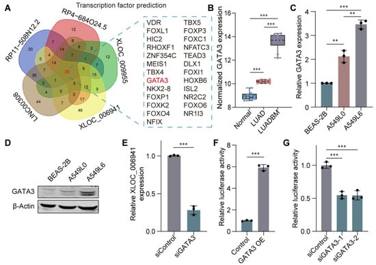 GATA3 functions as a transcription factor of the ceRNA network in LUADBM. (A) Venn diagram illustrating the number of transcription factors potentially binding to motifs within five lncRNAs, analyzed using the JASPAR database; (B) Normalized GATA3 expression in microarray data from normal, LUAD, and LUADBM tissues; (C) Relative RNA expression of GATA3 in A549L0 and A549L6 cells compared to BEAS-2B cells; (D) Protein expression of GATA3 in BEAS-2B, A549L0, and A549L6 cells; (E) Relative XLOC_006941 expression in GATA3 knockdown cells compared to control cells; (F) Relative luciferase activity of XLOC_006941 promoter reporter in A549L6 cells with or without GATA3 overexpression; (G) Relative luciferase activity of XLOC_006941 promoter reporter in A549L6 cells with or without GATA3 knockdown. Data shown represent mean ± s.e.m. (n = 3). ** p < 0.01, *** p < 0.001; p values were analyzed by the unpaired, two-tailed t-test or one-way ANOVA multiple comparisons test.