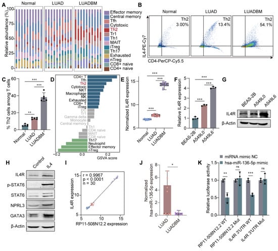 Increased Th2 cell infiltration and a GATA3/RP11-508N12.2/hsa-miR-136-5p/IL4R ceRNA axis contribute to LUADBM progression. (A) Immune cell abundance in LUADBM; (B) Representative flow cytometry plots of Th2 cells within T cells in normal, LUAD, and LUADBM tissues; (C) Percentages of Th2 cells within T cells in normal, LUAD, and LUADBM tissues; (D) GSVA analysis of the 7 mRNAs in the ceRNA network using the immune dataset; (E) Normalized IL4R expression in LUAD and LUADBM tissues; (F) IL4R RNA expression in BEAS-2B, A549L0, and A549L6 cells; (G) IL4R protein expression in BEAS-2B, A549L0, and A549L6 cells; (H) Protein expression following 200 ng/mL IL4 treatment for 30 min in A549L6 cells; (I) Correlation between RP11-508N12.2 and IL4R in LUADBM microarray data; (J) Normalized expression of hsa-miR-136-5p in LUAD and LUADBM tissues; (K) R Luciferase activity showing interaction between RP11-508N12.2 WT/Mut or IL4R 3′UTR WT/Mut and hsa-miR-136-5p. WT, wild type; Mut, mutant. Data shown represent mean ± s.e.m. (n = 3). ns, not statistically significant, * p < 0.05, ** p < 0.01, *** p < 0.001; p values were analyzed by the unpaired, two-tailed t-test or one-way ANOVA multiple comparisons test.