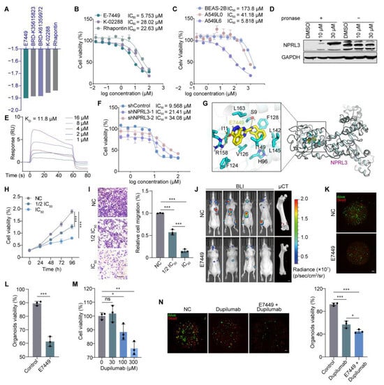 We then evaluated the effects of E7449 and two other available compounds on A549L6 cells to determine their IC50 values. E7449 demonstrated the most potent inhibitory effect, with an IC50 value of 5.753 μM (Figure 6B), and exhibited higher selectivity for A549L6 cells compared to BEAS-2B and A549L0 cells (Figure 6C). To assess its binding to NPRL3, we performed a drug affinity responsive target stability (DARTS) assay, which confirmed that E7449 directly interacts with NPRL3, protecting it from protease degradation (Figure 6D). This interaction was further validated by surface plasmon resonance (SPR) analysis, which revealed a dissociation constant (Kd) of 11.8 μM (Figure 6E). To confirm the role of NPRL3 in mediating the effects of E7449, we performed NPRL3 knockdown using shRNA. This resulted in reduced cell viability and a corresponding increase in the IC50 values of E7449, reinforcing the idea that NPRL3 is essential for the therapeutic efficacy of E7449. (Figure 6F and Figure S6B). Molecular docking analysis based on the cryo-EM structure of NPRL3 (PDB ID: 6CES) further predicted high-affinity binding of E7449 to the N-terminal longin domain of NPRL3 (Figure 6G).