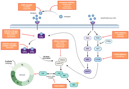 Mechanisms of action of endocrine and targeted therapies used for the treatment of ER+/HER2- metastatic breast cancer. Figure is created in BioRender. A, androgens; AKT, protein kinase B; CDK, cyclin-dependent kinase; E, estrogens; E2F, early region 2 binding factor; ER, estrogen receptor; FGF, fibroblast growth factor; GnRH gonadotropin-releasing hormone; MAPK, mitogen-activated protein kinase; MEK, mitogen-activated protein kinase kinase; mTOR, mammalian target of rapamycin; P, phosphate; PI3K, phosphatidylinositol 3-kinase; PTEN, phosphatase and tensin homolog; RAF, rapidly accelerated fibrosarcoma; RAS, rat sarcoma; RB1, retinoblastoma tumour suppressor protein.
