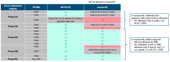 Comparison of NATALEE and monarchE trial inclusion criteria according to TNM staging. A Determined to be high risk by Oncotype DX/Prosigna/MammaPrint/EndoPredict. AJCC, American Joint Committee on Cancer; G, grade; M, metastasis; N, lymph node; T, tumour.