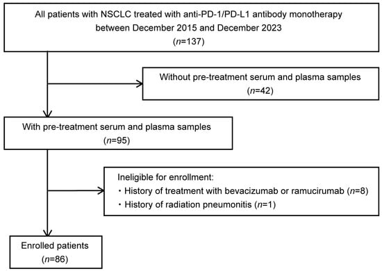 Flowchart of patient enrollment. This study included patients with non-small-cell lung cancer (NSCLC) treated with anti-programmed cell death 1(PD-1)/programmed cell death ligand 1(PD-L1) antibody monotherapy (nivolumab, pembrolizumab, or atezolizumab) at the Department of Respiratory Medicine, Hiroshima University Hospital, between December 2015 and December 2023, for whom serum and plasma samples were stored. After excluding eight patients who had a history of bevacizumab or ramucirumab prior to anti-PD-1/PD-L1 antibody administration and one patient who developed radiation pneumonitis just prior to the initiation of anti-PD-1/PD-L1 antibody monotherapy, 86 patients were finally included in the study. NSCLC, non-small-cell lung cancer; PD-1, programmed cell death 1; PD-L1, programmed cell death ligand 1.