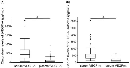 - Yamakuchi, M.; Okawa, M.; Takenouchi, K.; Bibek, A.; Yamada, S.; Inoue, K.; Higurashi, K.; Tabaru, A.; Tanoue, K.; Oyama, Y.; et al. VEGF-A165 is the predominant VEGF-A isoform in platelets, while VEGF-A121 is abundant in serum and plasma from healthy individuals. PLoS ONE 2023, 18, e0284131. [Google Scholar] [CrossRef]