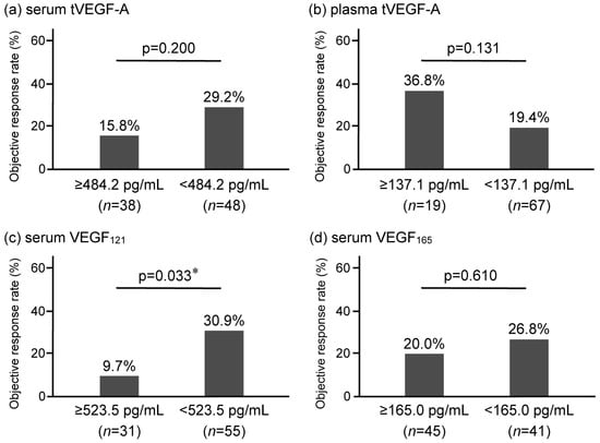 The ORR was significantly lower in patients with higher levels of serum VEGF121 (≥523.5 pg/mL) than in those without (9.7% vs. 30.9%, p = 0.033), although there was no significant difference in the ORR between patients with and without VEGF165 serum levels higher than 165.0 pg/mL (20.0% vs. 26.8%, p = 0.610) (Figure 3c,d). Univariate and multivariate logistic regression analyses revealed that, among circulatory tVEGF-A and its isoforms, only higher levels of serum VEGF121 were independently and significantly associated with a failure to achieve the objective response (Table 3).