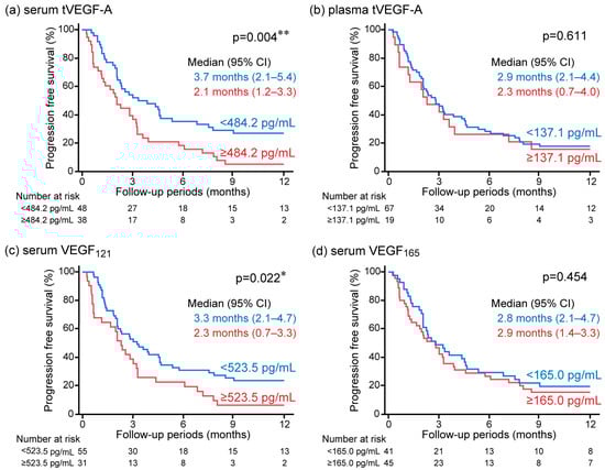Kaplan–Meier analysis for progression-free survival (PFS) in anti-programmed cell death 1/programmed cell death ligand 1 antibody monotherapy in non-small-cell lung cancer stratified by baseline (a) serum tVEGF-A, (b) plasma tVEGF-A, (c) serum VEGF121, and (d) serum VEGF165. Patients with higher levels of serum tVEGF-A showed significantly shorter PFS than those with lower levels (a), but no significant difference in PFS was observed when stratified by plasma tVEGF-A (b). Also, patients with higher levels of serum VEGF121 showed significantly shorter PFS than those with lower levels (c), but there was no significant difference in PFS when evaluated by serum VEGF165 (d). CI, confidence interval; PFS, progression-free survival; tVEGF, total vascular endothelial growth factor. * p < 0.05 and ** p < 0.01 using the log-rank test.