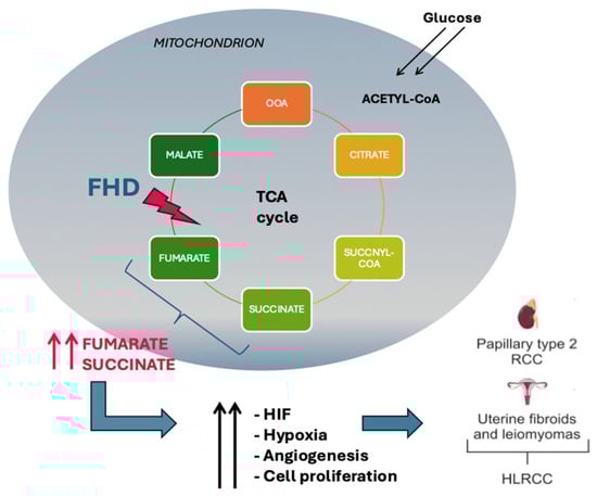 Fumarate hydratase (FH) deficiency is a rare metabolic disorder that disrupts the normal function of the citric acid cycle, an essential pathway for cellular energy production. The FH enzyme catalyzes the hydration of fumarate to malate, a critical step in the citric acid cycle. Mutations in the FH gene lead to a loss of enzyme activity, resulting in the accumulation of fumarate within cells. This accumulation causes a cascade of metabolic disorders, impacting cellular respiration and energy production. The citric acid cycle, also known as the Krebs cycle, plays a central role in cellular metabolism by oxidizing acetyl-CoA to carbon dioxide and capturing high-energy electrons in the form of nicotinamide adenine dinucleotide (NADH) and flavin adenine dinucleotide (FAD)H2, which are used in the electron transport chain to generate adenosine triphosphate (ATP). FH deficiency disrupts this cycle, leading to reduced production of ATP and an increased reliance on glycolysis for energy, which is less efficient and produces lactic acid as a byproduct. This shift in metabolism is known as the Warburg effect and is commonly observed in cancer cells [3]. Mutations in the FH gene have been identified in various types of tumors, including hereditary leiomyomatosis and renal cell carcinoma (HLRCC), a condition characterized by the development of multiple benign and malignant tumors. The accumulation of fumarate in cells with FH mutations can inhibit prolyl hydroxylases, leading to the stabilization of hypoxia-inducible factor (HIF), a transcription factor that promotes angiogenesis, cell proliferation, and survival under low oxygen conditions. This aberrant activation of HIF pathways could contribute to tumor growth and survival, providing a crucial link between FH deficiency and oncogenesis. In addition to its role in the citric acid cycle, fumarase has been shown to have tumor suppressor functions, and its loss of function can drive tumorigenesis through various mechanisms, including epigenetic modifications. Accumulated fumarate can act as an oncometabolite, leading to the inhibition of histone and DNA demethylases, resulting in widespread changes in gene expression that favor tumor development and progression [3,6] (Figure 1).