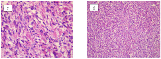 (1,2) Leiomyomas associated with FH deficiency and their histological changes. (1) Presence features with vague nuclear palisading and prominent nuclear pleomorphism; (2) the most significant characteristics include marked nuclear pleomorphism and the presence of multinucleated cells. Furthermore, certain nuclei display pseudoinclusions, along with eosinophilic cytoplasmic globules.