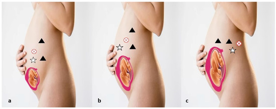 Robotic ports position (black triangle: robotic-8 mm trocar; white star: 12 mm trocar assistant; white circle: robotic-8 mm trocar camera position) in pregnancy during: 1st Trimester (a); 2nd Trimester (b); 3rd Trimester (c).