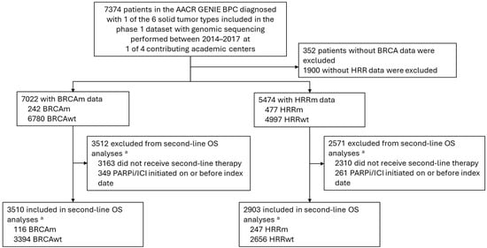 Study flow diagram. AACR GENIE BPC, American Association for Cancer Research Genomics Evidence Neoplasia Information Exchange Biopharma Collaborative; BRCA, BRCA1 and/or BRCA2; BRCAm, BRCA mutation; BRCAwt, BRCA wild-type; HRRm, homologous recombination repair mutation; HRRwt, homologous recombination repair wild-type; ICI, immune checkpoint inhibitor; OS, overall survival; PARPi, poly (ADP ribose) polymerase inhibitor. a Primary analysis.