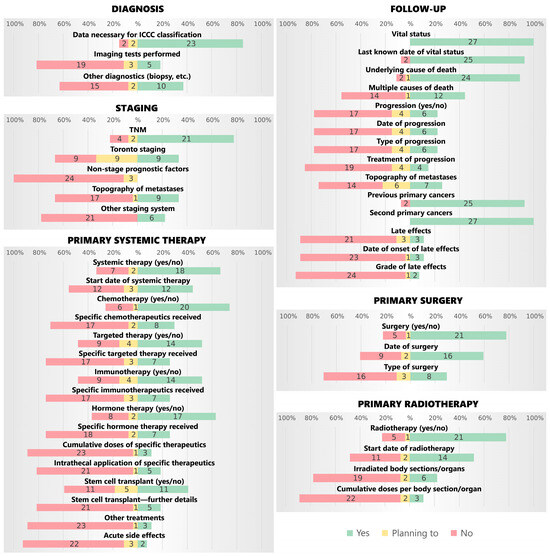 First, to map cancer registry practices, we sent out an online questionnaire-based survey to members of the ENCR. The survey was open to the members from 1 July 2022 to 31 August 2022 via the EUSurvey tool, emailed directly to 140 members (the majority of which, around 70%, were regional, and 30% were national) and advertised in the ENCR Newsflash for July 2022 with an additional reminder to boost the response rate. The complete questionnaire is available in Appendix A. It was divided into several sections, the first on the coverage of the registry (national/regional, the age range of pediatric patients, the malignant and non-malignant entities included), the second on whether PBCRs collect or are planning to collect detailed data (on the diagnosis, staging, treatment, progression, vital status follow-ups and other data) and the third on whether they register late effects data or are planning to, as well as how these data are or are going to be collected and coded. The survey results were analyzed using descriptive statistics; namely, we categorized questions addressing the availability of variables into categories (diagnosis, staging, follow-up, primary systemic therapy, surgery and radiotherapy) and reported the number and percentage of registries who answered either “yes”, “no” or “planning to” to questions from each category regarding the collection of specific variables. Furthermore, individual registries were ranked according to their category and overall summary scores, which were calculated by summing answer-specific scores (0 points were allocated to answers of “no”, 1 point for answers of “planning to” and 2 points for answers of “yes”). The data were presented in stacked bars and heat maps.