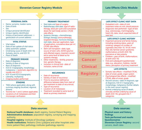 The SCCCR has two modules: (1) Since the primary aim was to create a platform that would enable the systematic registering and long-term monitoring of late effects (in terms of morbidity and mortality) in a population of CACSs, one module was designed for direct use by clinicians at the Late Effects Clinic at the Institute of Oncology Ljubljana, where entry is possible either retrospectively or prospectively, allowing them to access all historical data during patients’ visits and the ongoing collection of clinical data from exams, questionnaires and other follow-up findings. This module does not have 100% population coverage, as patients eligible for follow-up are those treated for tumours at the Pediatric Clinic (over 80% of all cases aged 0–14 years, fewer adolescents), aged 18 years or more and at least three years post treatment, but the coverage for the eligible population is almost complete. (2) For the proper evaluation of the burden of late effects in survivors, data on the primary cancer and treatment received are also of vital importance. Therefore, the secondary aim was to collect as much detailed data on disease and treatment as possible through a module managed by specially trained SCR staff, who extract the data manually directly from electronic patient records held at the Pediatric Clinic at the University Medical Centre Ljubljana, which treats the vast majority of children and adolescents with cancer, as well as other treating institutions. This module covers the whole childhood and adolescent cancer patient population and started collecting data since the incidence year of 2019. Of note, the cumulative doses per m2 of the body surface of systemic therapy and cumulative radiation doses per organ are collected. This allows for analyses of the quality of treatment, as well as the short- or long-term outcomes.