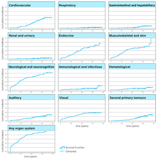 The results of Kaplan–Meier analyses (Figure 3) revealed that CACSs with CNS tumours in the cohort were at risk for developing a multitude of organ-specific late effects (with the exception of reproductive late effects, of which none were registered) and second primary tumours long after their primary treatment had finished, though, in general, there was a levelling off in the cumulative curves after around 20–30 years. For endocrine late effects in particular, the cumulative incidence curve did not level off.