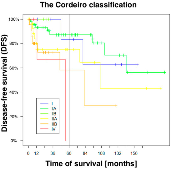 Disease-free survival (DFS) curves considering the Cordeiro classification. Since there were few patients with Cordeiro type IIB in the study group, it overlaps with Cordeiro type I.
