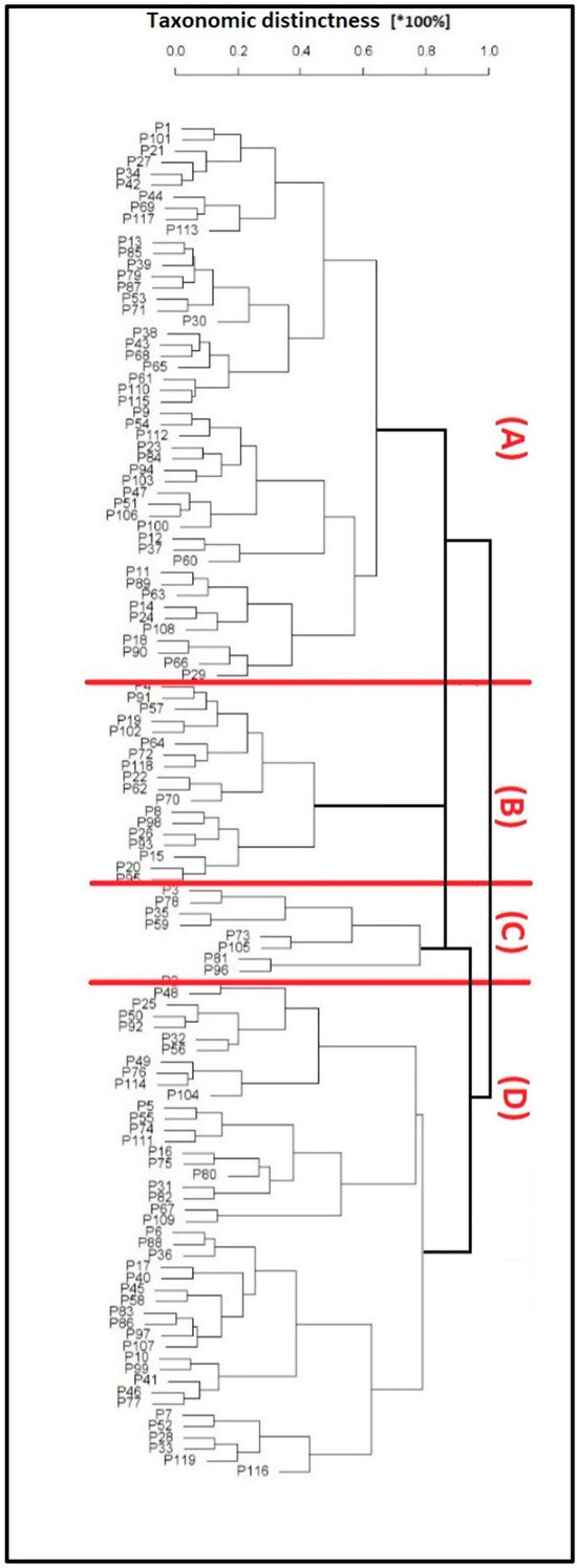 Taxonomic four clusters dendrogram (based on data from Table 4).