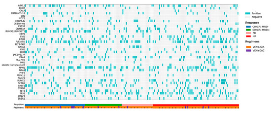 Genetic landscapes of 197 relapsed or refractory (R/R) acute myeloid leukemia (AML) patients. Oncoprint shows cytogenetic and mutational characteristics for all the R/R AML patients receiving venetoclax plus hypomethylating agents (VEN + HMAs). Patients are grouped by response and annotated with colored bars below the grid. The treatment regimens of each patient are annotated with colored bars below the response bar.