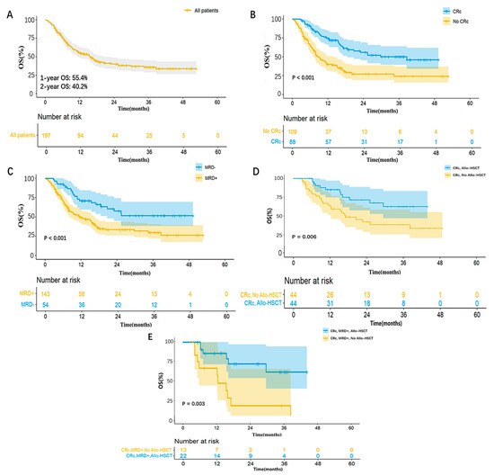 Overall survival (OS). (A), OS in all R/R AML patients (n = 197); (B), OS based on composite complete remission (CRc); (C), OS based on measurable residual disease (MRD) status after venetoclax plus hypomethylating agents (VEN + HMAs) therapy; (D), OS based on receiving allo-HSCT (Allogeneic hematopoietic stem cell transplantation) among patients achieving CRc after VEN + HMAs therapy; (E), OS based on receiving allo-HSCT among patients achieving CRc but MRD-positive after VEN + HMAs therapy.