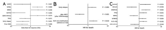 Multivariable analysis. (A) Predictors of response (composite complete remission [CRc]); (B) Clinical predictors of OS; (C) Genetic predictors of OS. Variables of p < 0.1 in univariable analysis (Tables S2 and S3) were included in this multivariable logistics model.