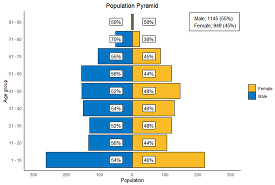 The median age at diagnosis was 33 years (IQR, 12–52 years). The number of pediatrics and adults was 652 (31.1%) and 1442 (68.9%), respectively. Males outnumbered females 1145 (54.7%) to 949 (45.3%). Figure 1 describes the sex distribution across different age groups.