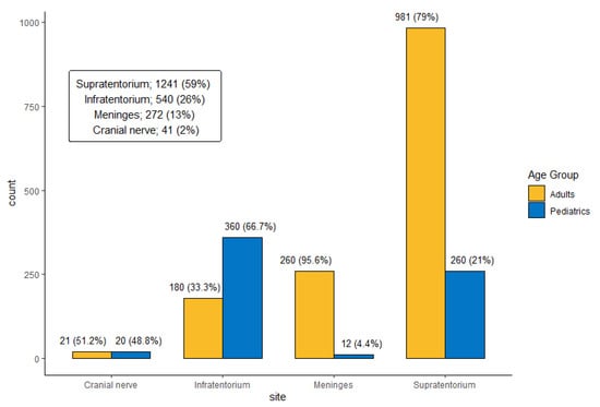 The most common tumor site was the supratentorium (n = 1241 [59.3%]), followed by the infratentorium (n = 540 [25.8%]), meninges (n = 272 [13.0%]), and cranial nerves (n = 41 [2.0%]). Of all tumors, 719 (34.3%) were grade 1, 263 (12.6%) were grade 2, 224 (10.7%) were grade 3, and 888 (42.4%) were grade 4. Figure 2 and Figure 3 show the site distribution and grade per age group, respectively.
