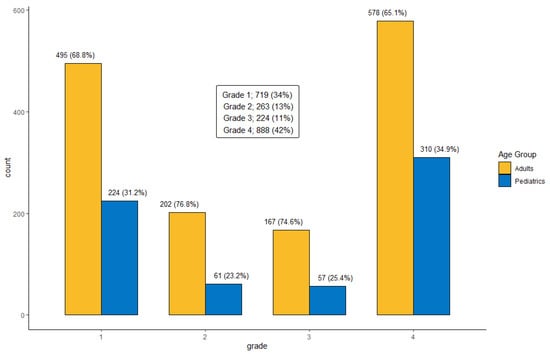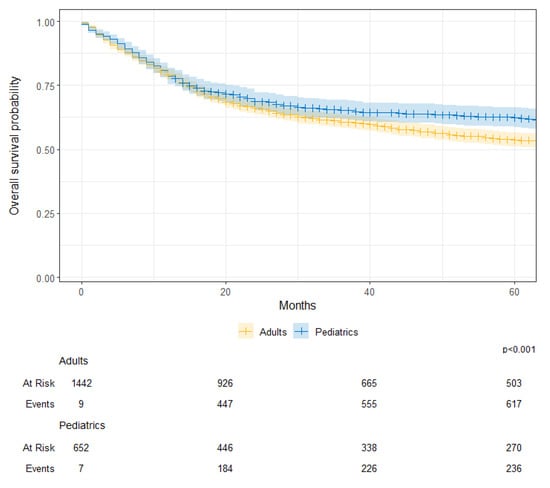 During the study period (2003–2019), several novel therapies for CNS tumors were introduced, including anti-VEGF agents such as bevacizumab and regorafenib, temozolomide (TMZ) in combination with radiotherapy, and tumor-treating fields (TTF) [,,,]. While specific therapy data were not available in our study, these advancements may have influenced survival outcomes, particularly among adults. Therapies such as TMZ and anti-angiogenic drugs have demonstrated differing efficacy and safety profiles between adults and pediatric patients, reflecting variations in tumor biology and treatment tolerability []. For instance, while TMZ is a well-established therapy for adult glioblastomas, its role in pediatric high-grade gliomas is less clearly defined []. This disparity may partially explain the significant survival differences observed between adult and pediatric patients in our cohort. Future studies incorporating detailed therapy information are necessary to evaluate the impact of these therapeutic advancements on survival outcomes.