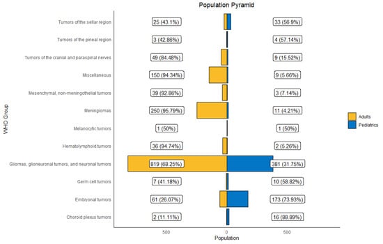 Table 1 shows tumors stratified by biological sex. Of 20 tumor types diagnosed at least 10 times, 13 types were more likely to occur in males, while 6 were more likely to occur in females. Germinoma, hemangioma, diffuse midline glioma, pediatric-type diffuse low-grade gliomas, medulloblastoma, adult-type diffuse gliomas, and glioneuronal and neuronal tumors were at least 1.2 times more likely to occur in males. On the other hand, meningiomas were more likely to occur in females. Table 2 also lists tumor entities, as per the WHO classficaition, stratified by location of origin.