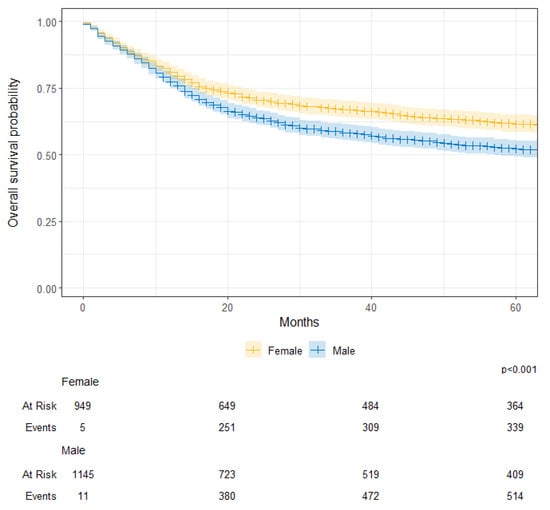 The 1-, 2-, and 5-year OS rates for the adult cohort were 79% (77–81%), 66% (64–69%), and 54% (51–56%), respectively. There were significant differences in OS per biological sex across the aforementioned cohort (p < 0.001) (Figure S2).