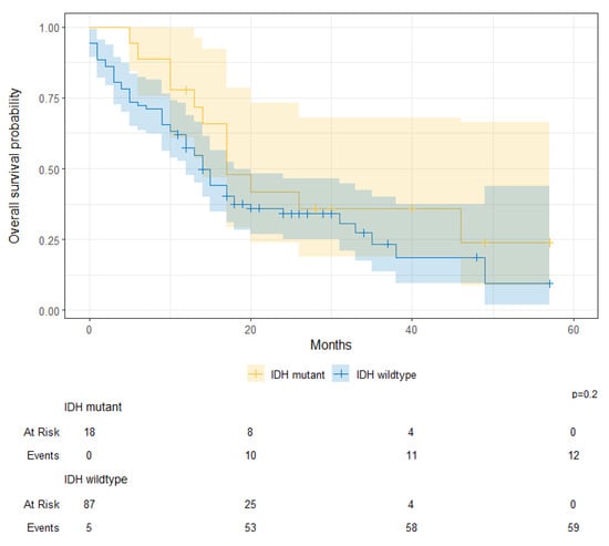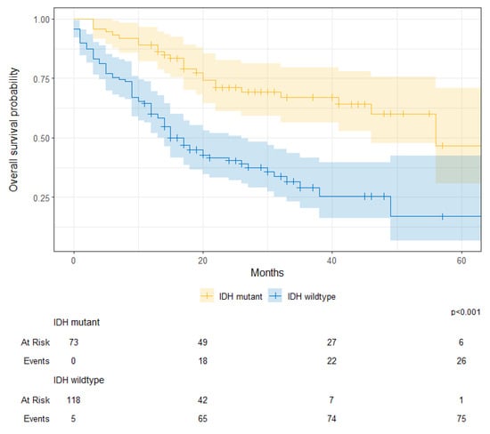 A separate sub-group analysis on cases where IDH mutations were examined demonstrated the following. Overall, tumors with IDH mutations had a survival advantage over wildtype cases (IDH-mutant 1-year OS, 89% [82–97%] vs. IDH-wildtype 1-year OS, 60% [52–70%]; p < 0.001) (Figure 7).