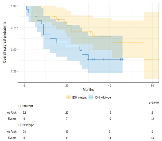 For patients with astrocytoma, there were significant survival differences between IDH-mutant and IDH-wildtype tumors (IDH-mutant 1-year OS, 91% [81–100%] vs. IDH-wildtype 1-year OS, 63% [46–85%]; p = 0.049), irrespective of the grade (Figure 8).